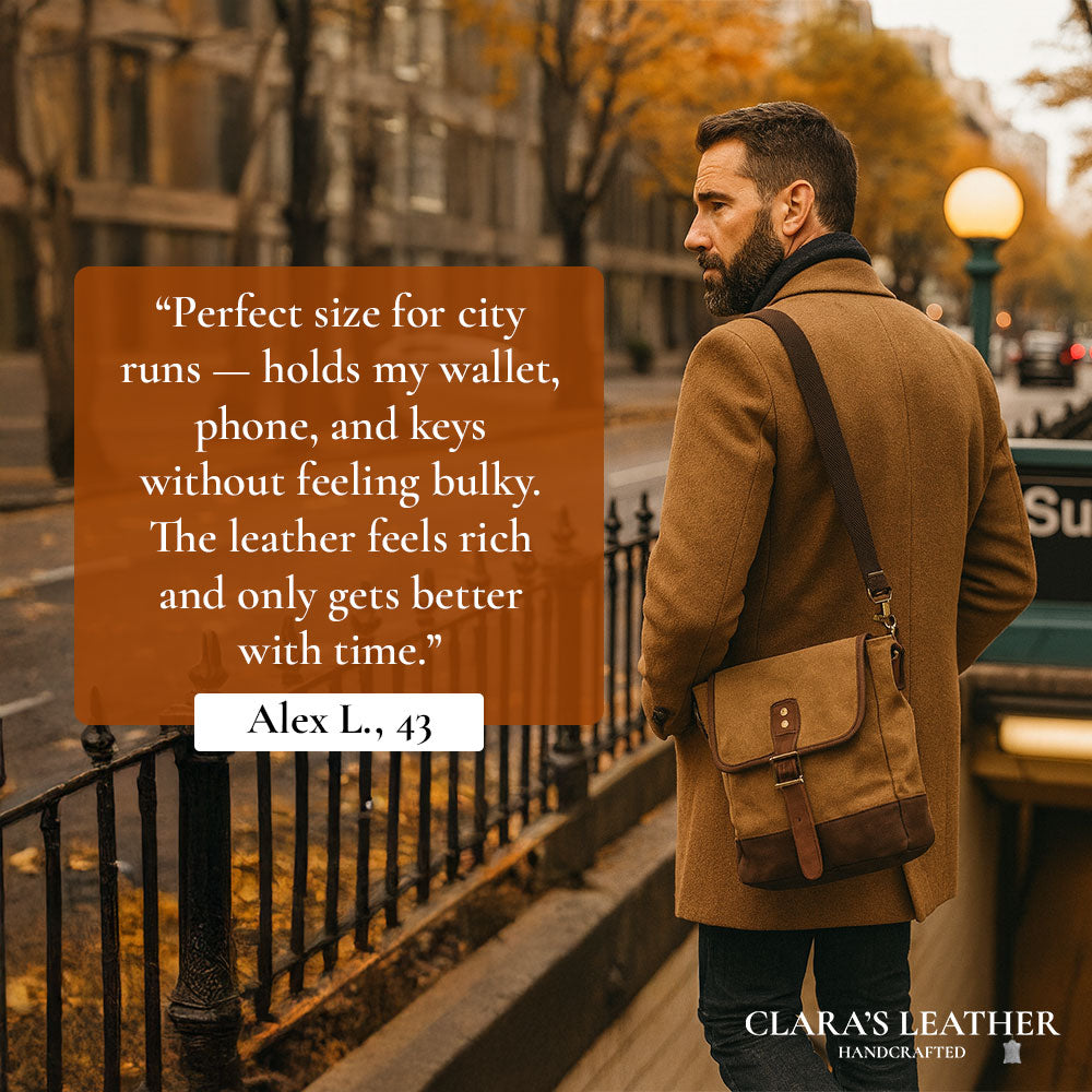 William – Small Canvas Leather Sling Bag is the perfect mix of vintage character and modern practicality, crafted for those who want a lightweight yet rugged companion for their everyday essentials. Made from durable waxed canvas and full-grain leather, this sling bag brings timeless style to your daily adventures—whether you're strolling through the city, commuting to work, or traveling light.